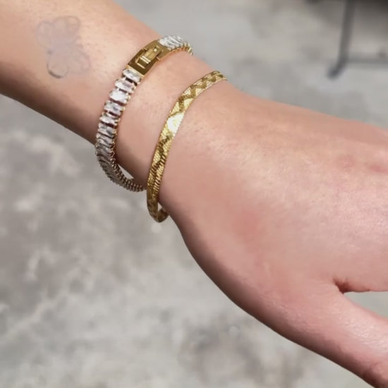 Unser vergoldetes "Snake Armband" besticht durch sein flach geflochtenes Design, das einen eleganten, seidigen Glanz erzeugt. Die feine Struktur des Gliederbands reflektiert das Licht sanft und verleiht jedem Look eine luxuriöse Note. Dank der verstellbaren Länge sitzt das Armband perfekt und trägt sich angenehm leicht.