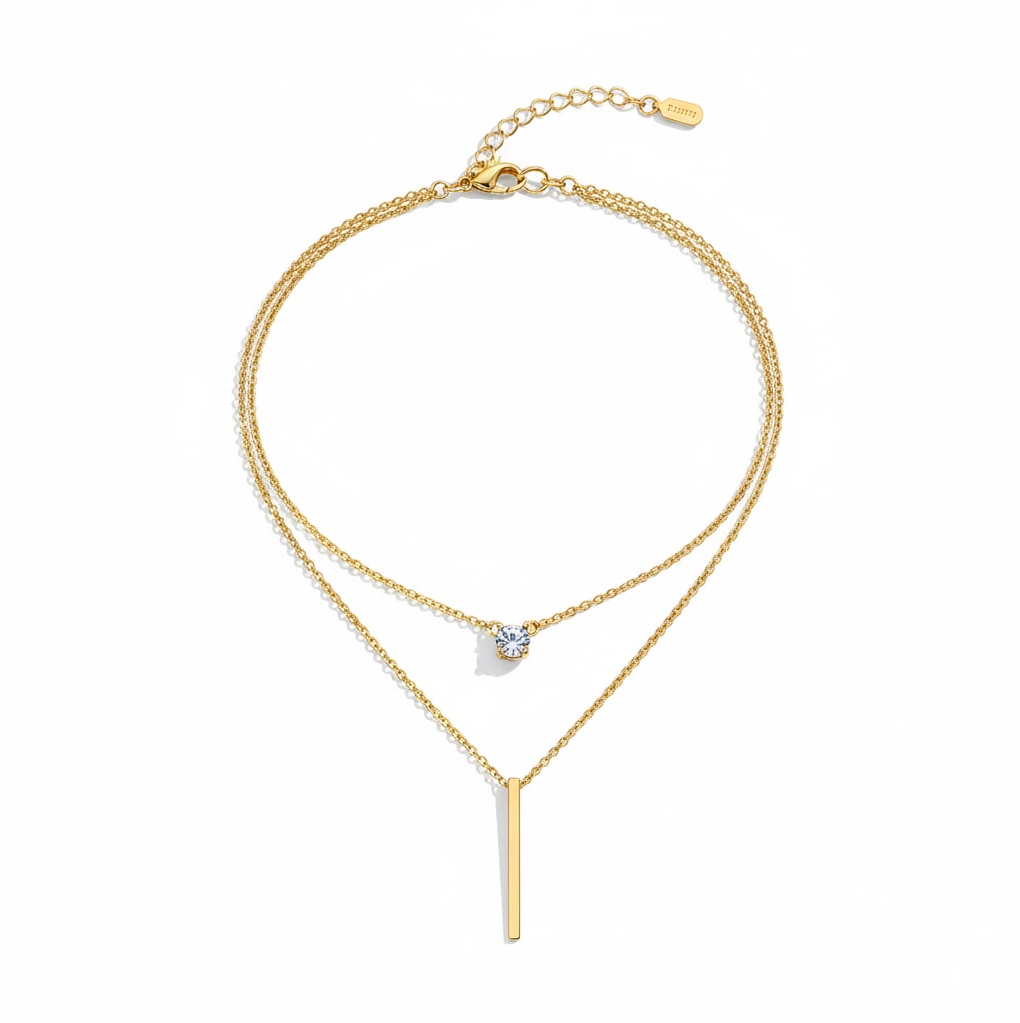 Die Golden Grace Halskette kombiniert zwei feine Ketten zu einem harmonischen, femininen Design. Ein funkelnder Zirkonia-Stein und ein schlichter, länglicher Anhänger schaffen ein perfektes Gleichgewicht aus Minimalismus und Eleganz. Ideal zum täglichen Tragen oder als zartes Statement bei besonderen Anlässen.