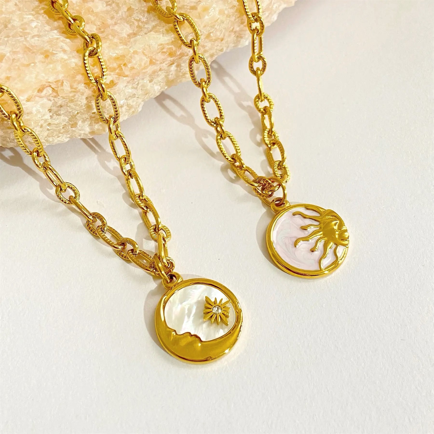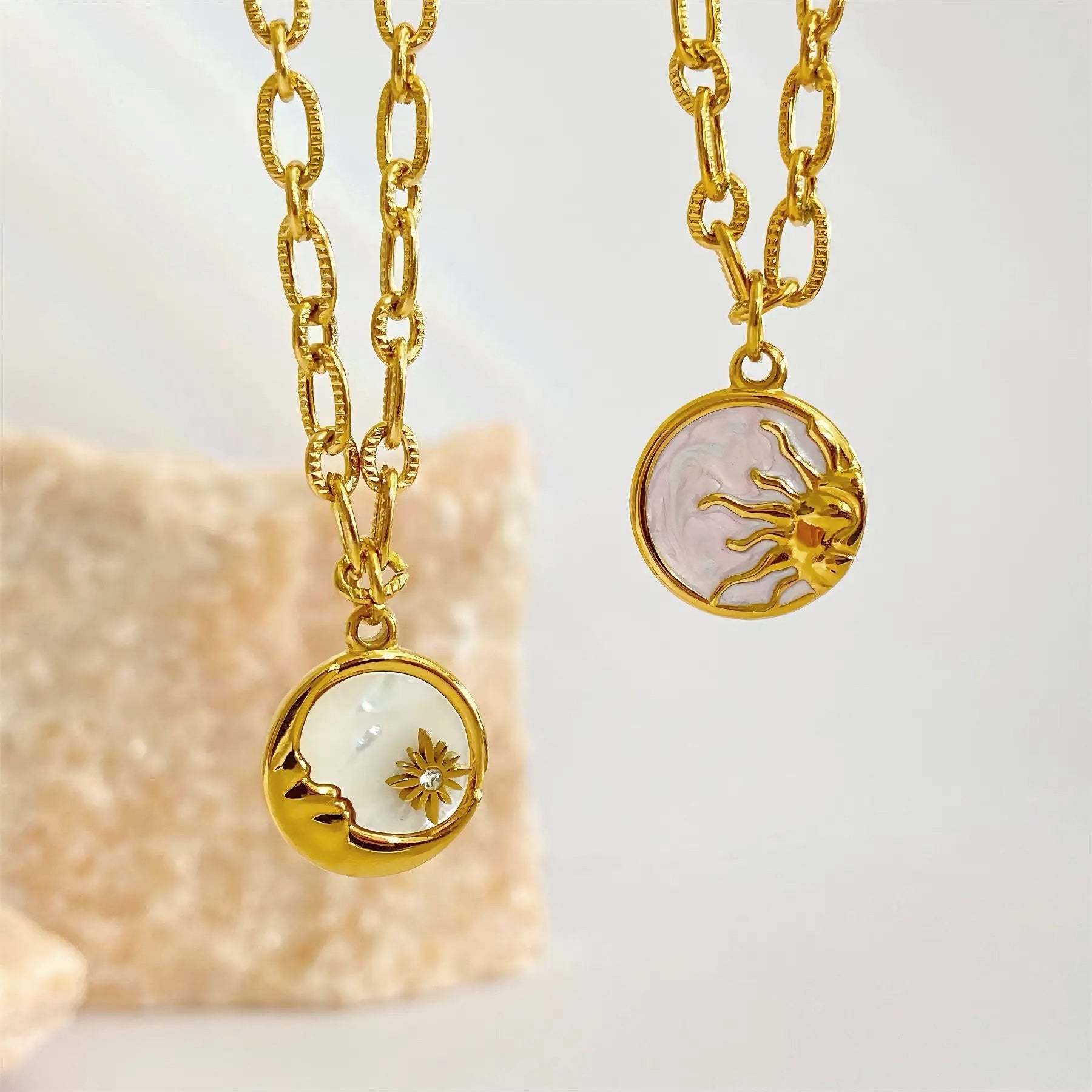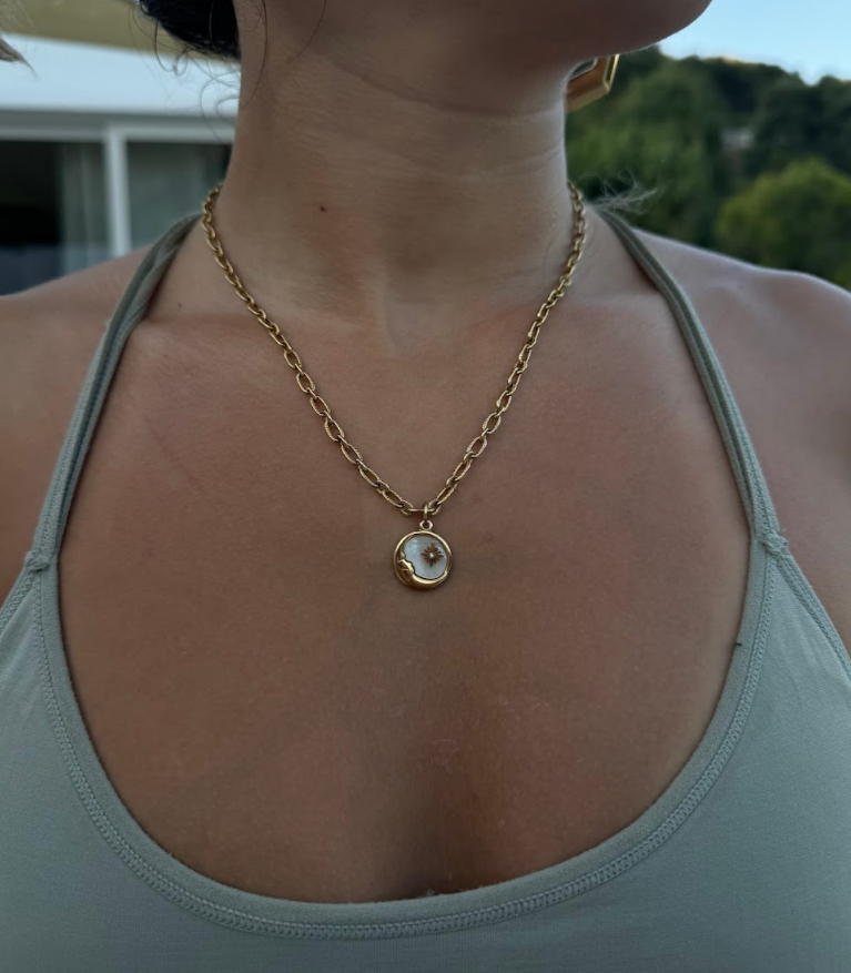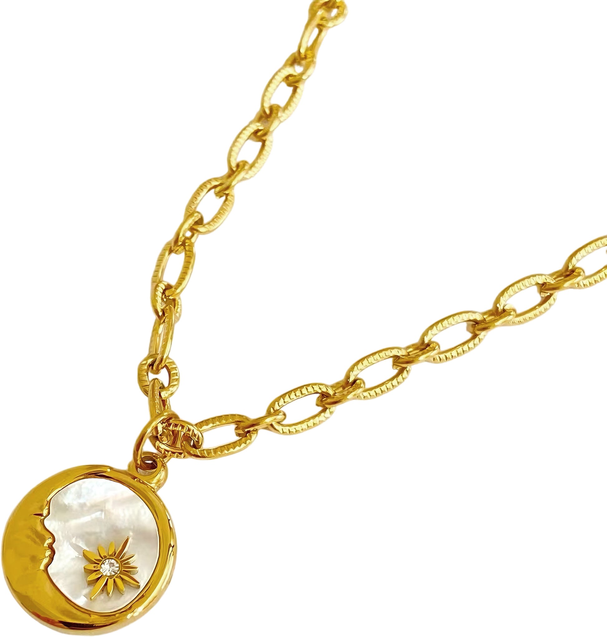 Die Noctis Halskette kombiniert ein klassisches Gliederketten-Design mit einem modernen, edlen Anhänger. Der runde Anhänger mit zartem Sonnenmotiv und glänzendem Perlmutt-Effekt fängt das Licht auf wunderschöne Weise ein. Diese Kette vereint warme Eleganz mit einem Hauch von Boho-Chic – perfekt, um jedem Look ein stilvolles Highlight zu verleihen.