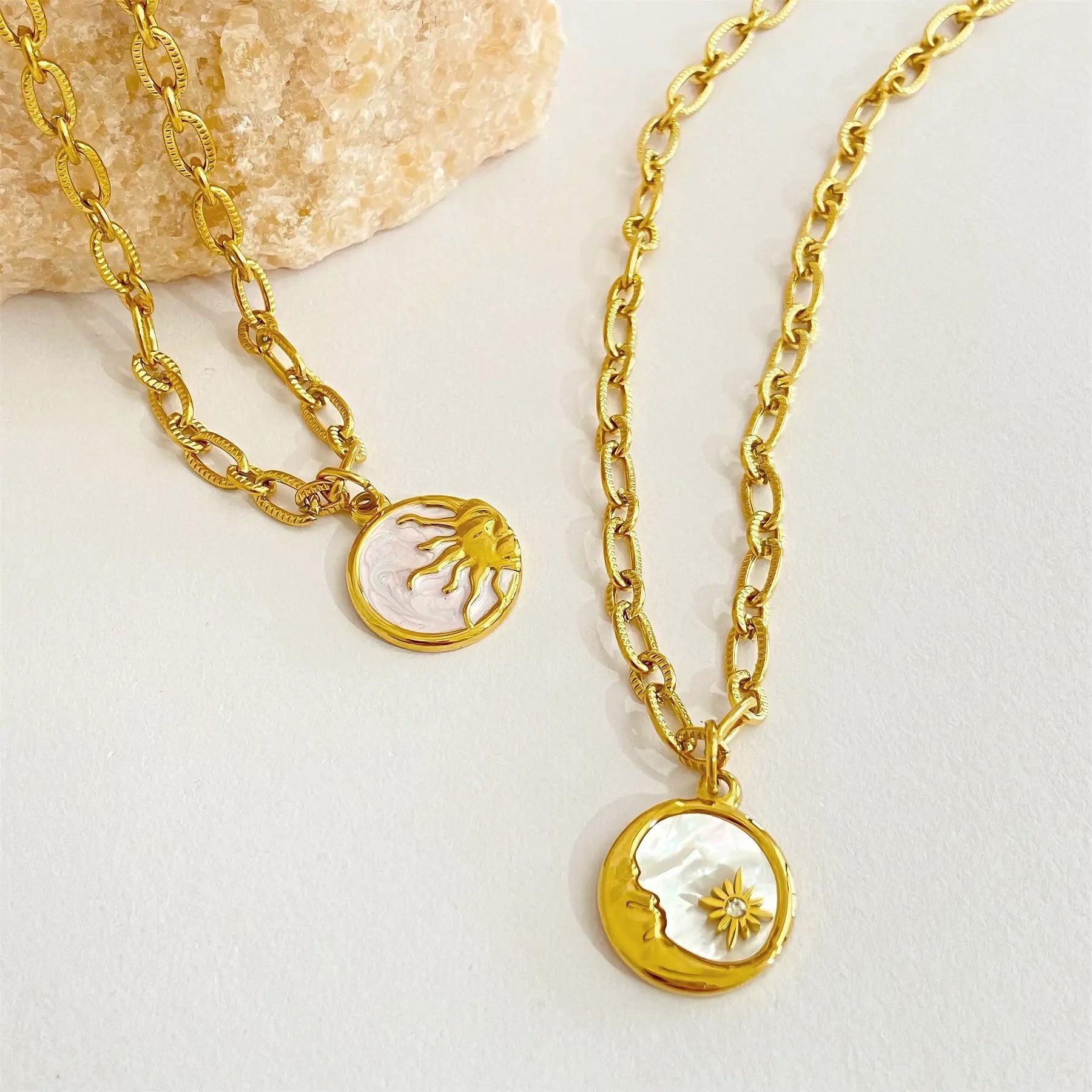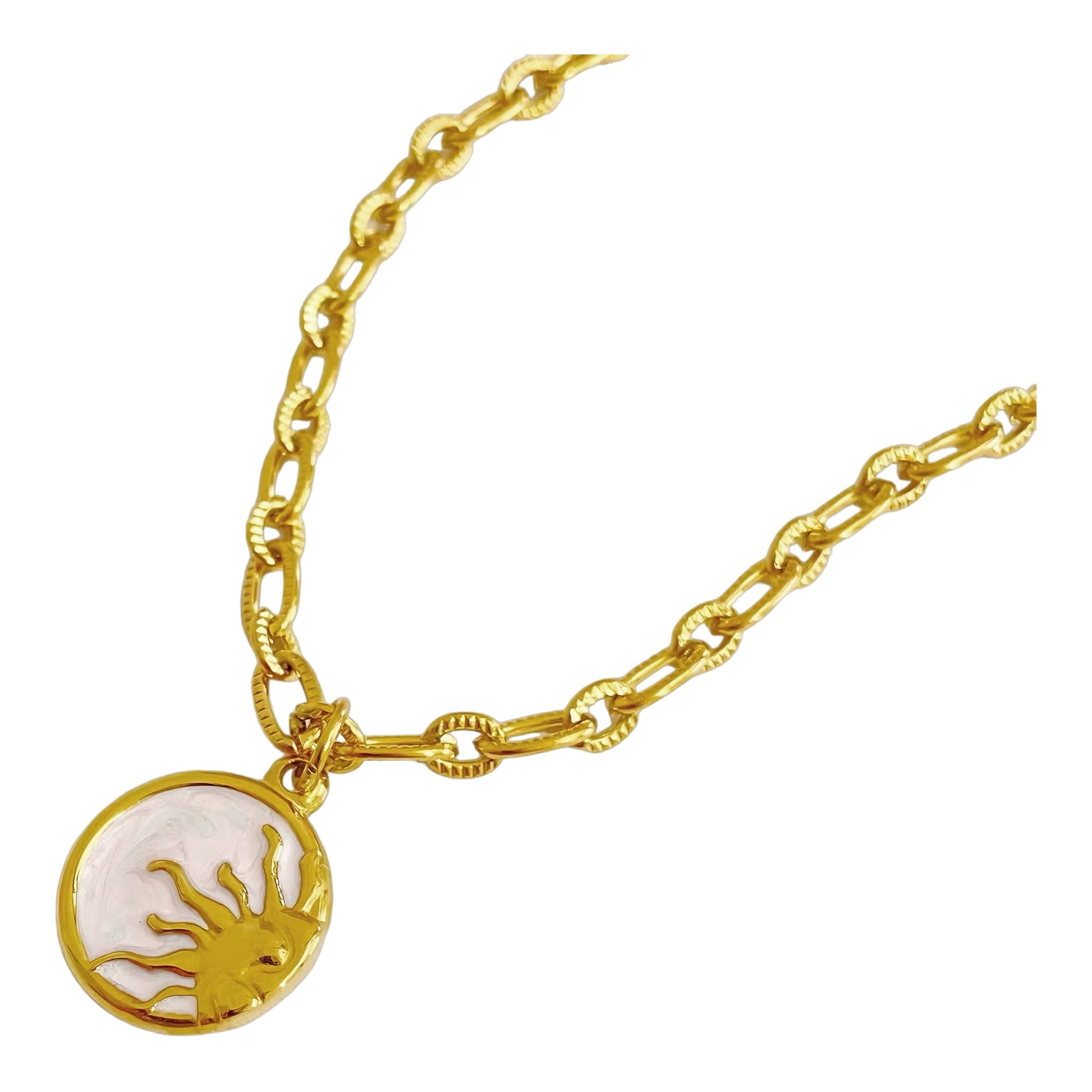 Die Aurora Halskette strahlt zeitlose Eleganz und Symbolkraft aus. Der vergoldete Anhänger zeigt eine kunstvoll gearbeitete Sonne, die sich über eine schimmernde Perlmuttfläche legt – ein Design, das Licht und Wärme einfängt. Mit ihrer markanten Gliederkette und dem edlen Glanz ist sie das perfekte Statement-Piece für jeden Anlass.